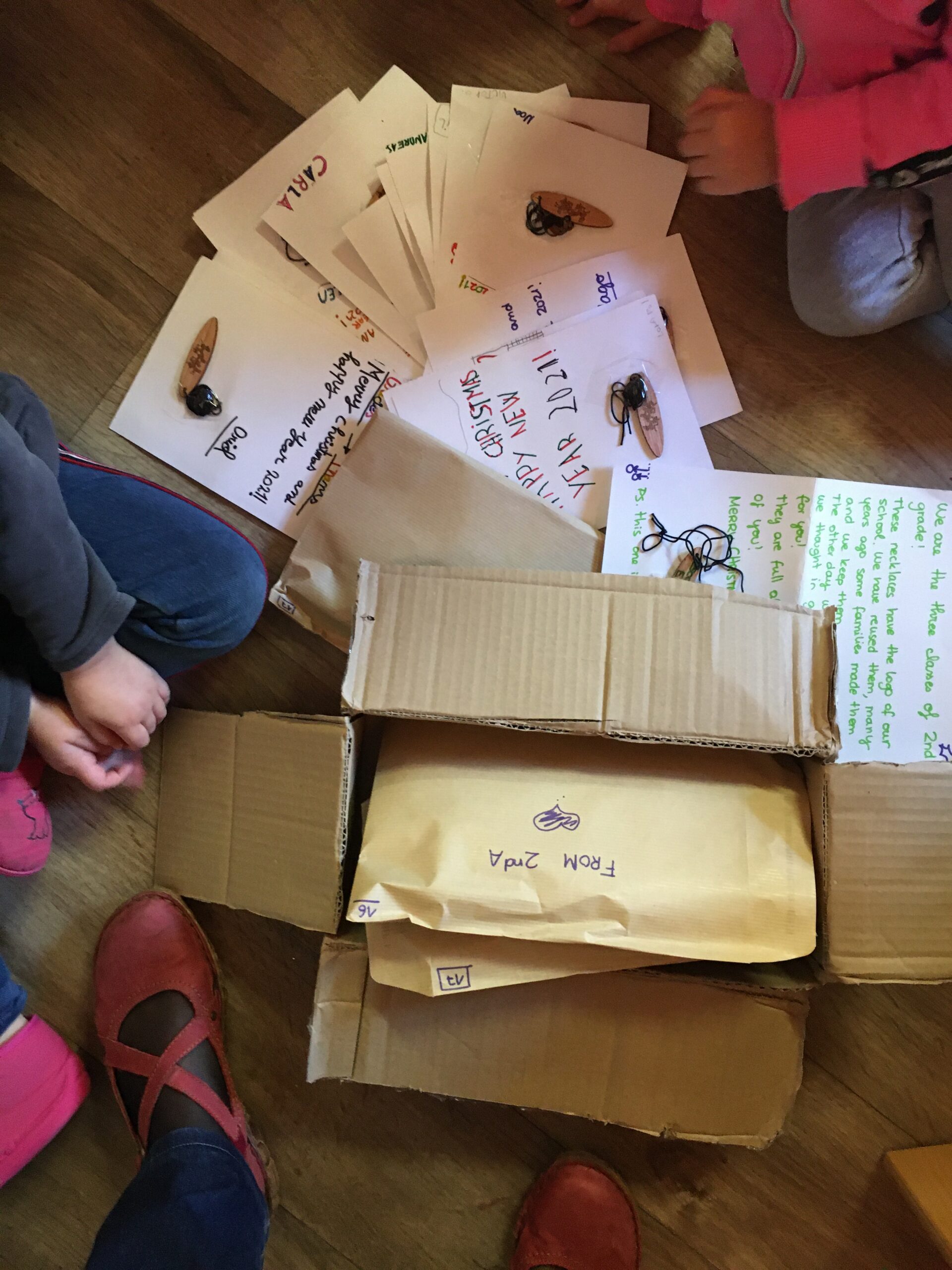 La scuola partner spagnola aveva postato nel TwinSpace un video dove si vedeva come realizzare dei piccoli oggettini calamitati riciclando tappi di plastica, trasformandoli in api e pecorelle. Dopo pochi giorni gli stessi oggetti calamitati sono arrivati realmente a scuola, spediti dagli amici spagnoli, in regalo proprio per noi italiani. Per Natale abbiamo ascoltato i canti tradizionali degli amici europei tante volte. I bambini sono rimasti incantati ad ascoltare il canto della Lettonia: la loro musica ci ha fatto viaggiare con la mente e immergere in un’altra dimensione…