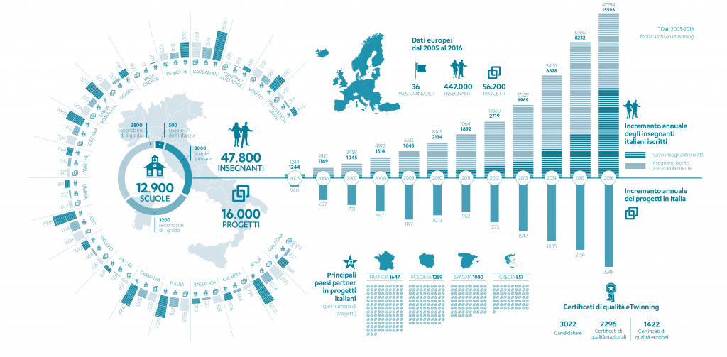 Si registra un incremento costante dei docenti italiani iscritti alla piattaforma, 47.800 (circa il 10% degli oltre 447.000 iscritti in tutta Europa) e un aumento dei nuovi progetti attivati: nel 2016 sono stati 3.248 (+51% rispetto al 2015). Le scuole registrate sono 12.900 e in media sono 3 gli insegnanti iscritti alla piattaforma in ciascun istituto.